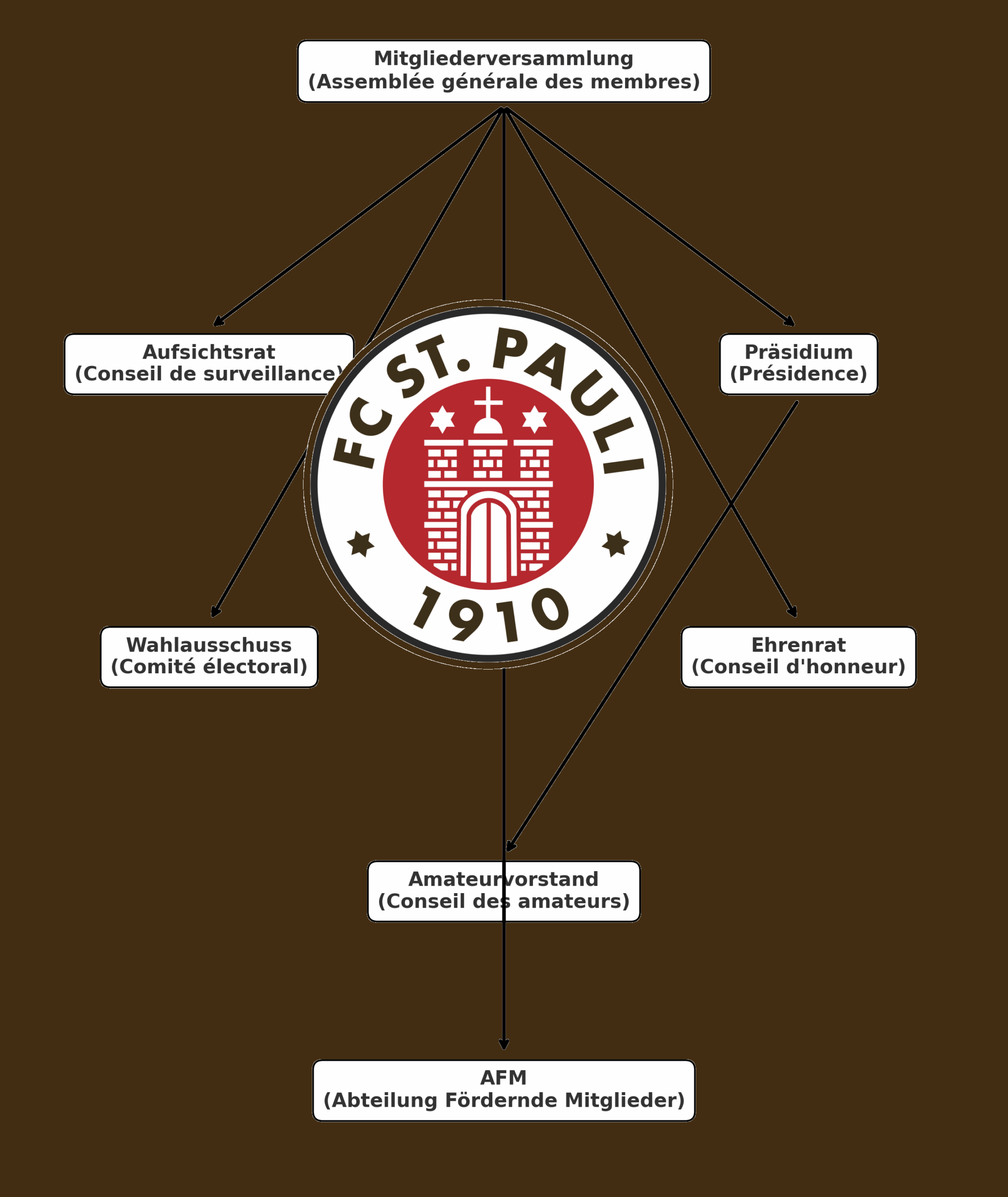 Le FC St. Pauli se distingue dans le monde du football professionnel par cette gouvernance associative où chaque instance est élue, contrôlée et indépendante. Là où la plupart des clubs se sont transformés en sociétés par actions dominées par des investisseurs, Hambourg maintient une logique de club de membres, où le pouvoir reste – en théorie et en pratique – entre les mains des adhérent·es.